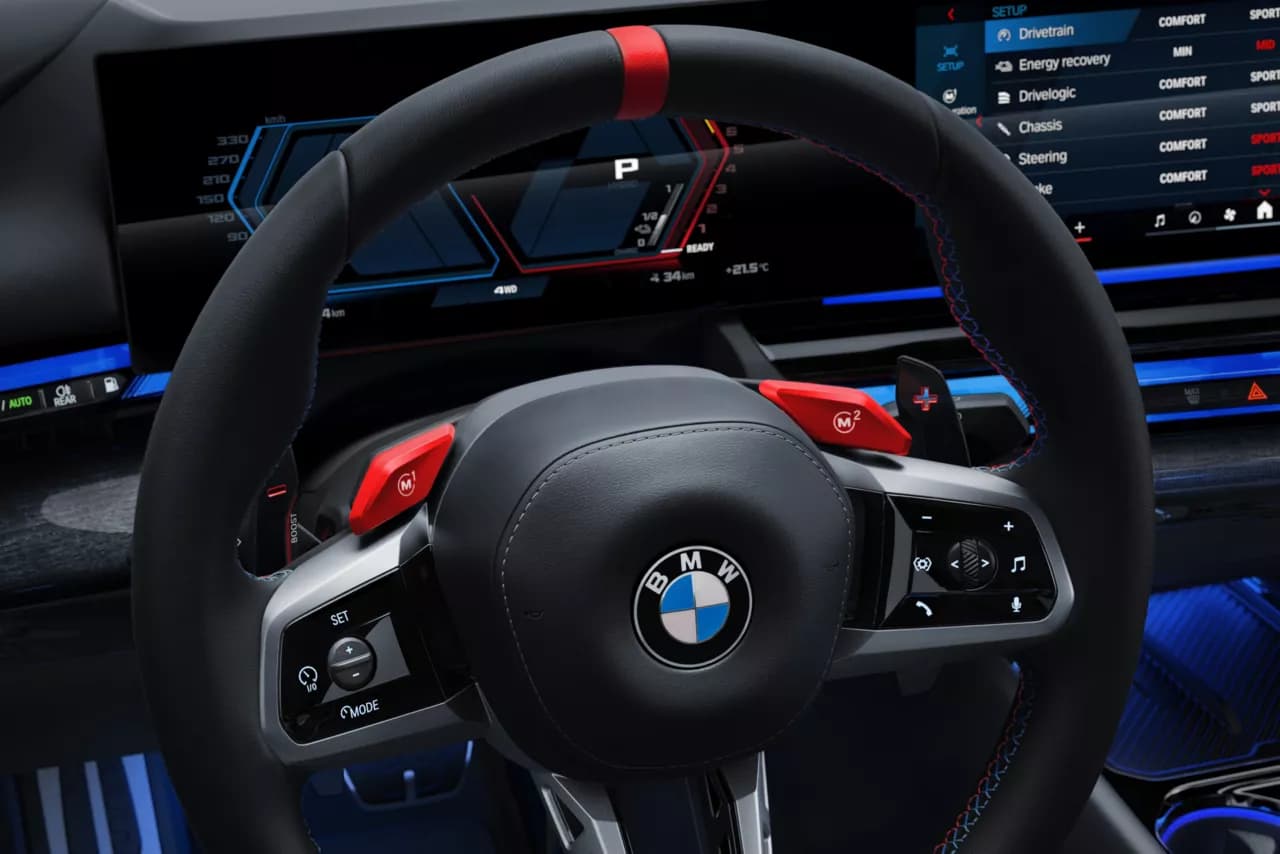 Un style sportif, des sensations sportives. Volant M avec repère rouge en position 12 heures, palettes de commande M et touches M1/M2 pour les réglages de conduite mémorisés.