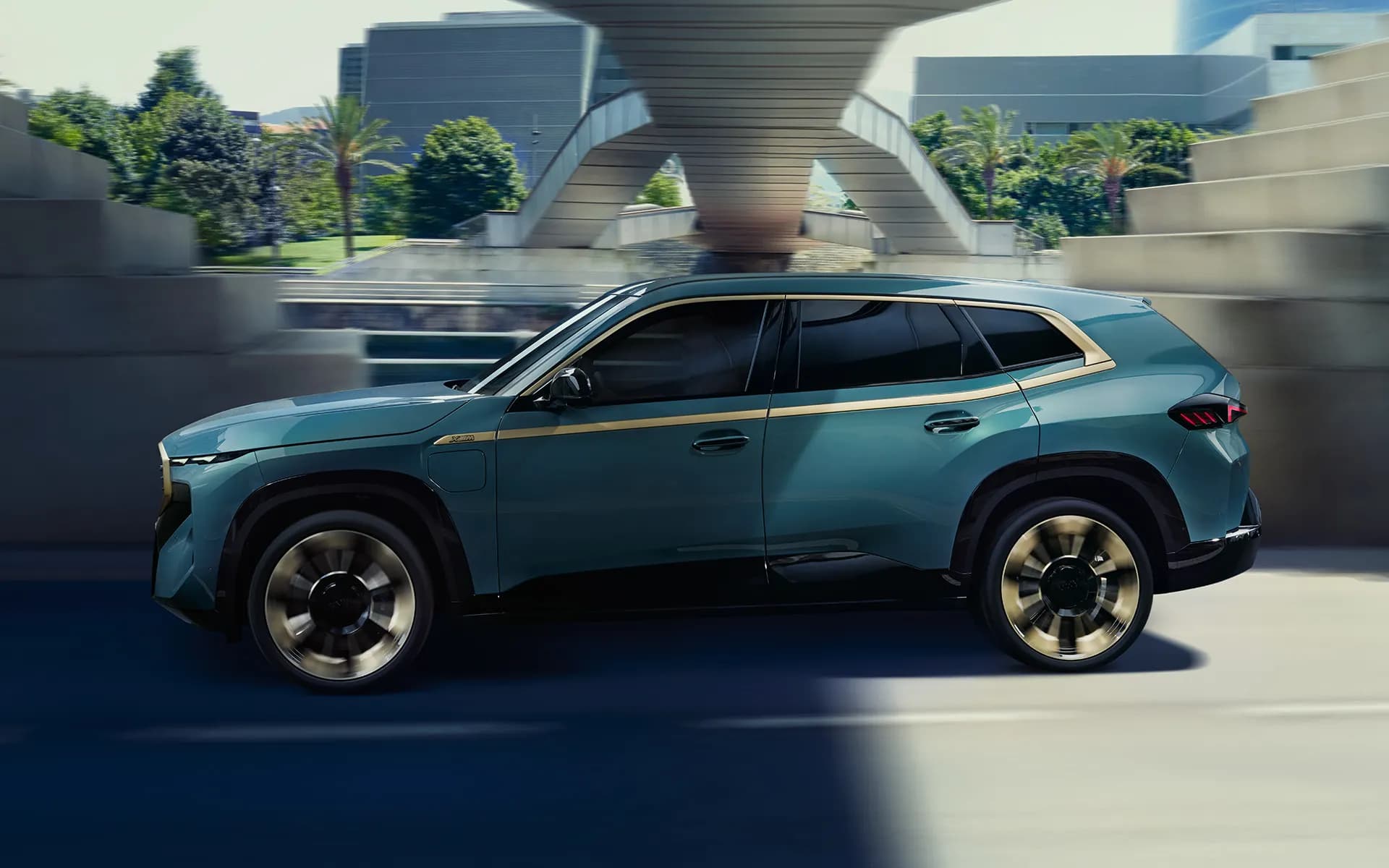 La vue de profil associe un design de caractère dans le style d'un coupé avec des proportions puissantes et des détails stylistiques tels que les vitres arrières les plus assombries de la gamme BMW. Les jantes exclusives de 23" tout comme la bande d'inserts qui rend la forme unique de la Nouvelle BMW XM sont particulièrement exclusives dans la teinte Night Gold.
